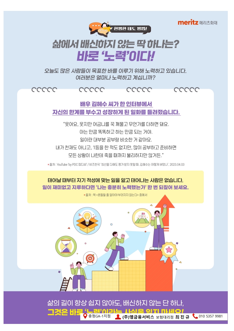 삶에서 배신하지 않는 딱 하나는? 바로 "노력"이다 페이지 정보 작성자 관리자 댓글 0건 조회 45회 작성일 25-10-23 17:38 본문 삶에서 배신하지 않는 딱 하나는? 바로 "노력"이다 목록 목록 이전글숨은 지출 잡아내는 생활요금 점검법 25.11.18 다음글사계절의 아름다움을 24절기로 알아봐요! 25.09.29