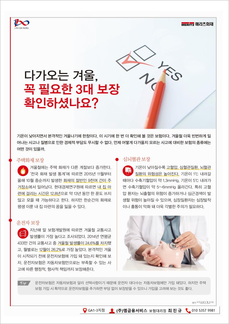 다가오는 겨울,꼭 필요한 3대 보장 확인하셨나요? 페이지 정보 작성자 관리자 댓글 0건 조회 393회 작성일 20-11-25 20:36 본문 다가오는 겨울,꼭 필요한 3대 보장 확인하셨나요? 목록 목록 다음글화재리플렛 20.09.15