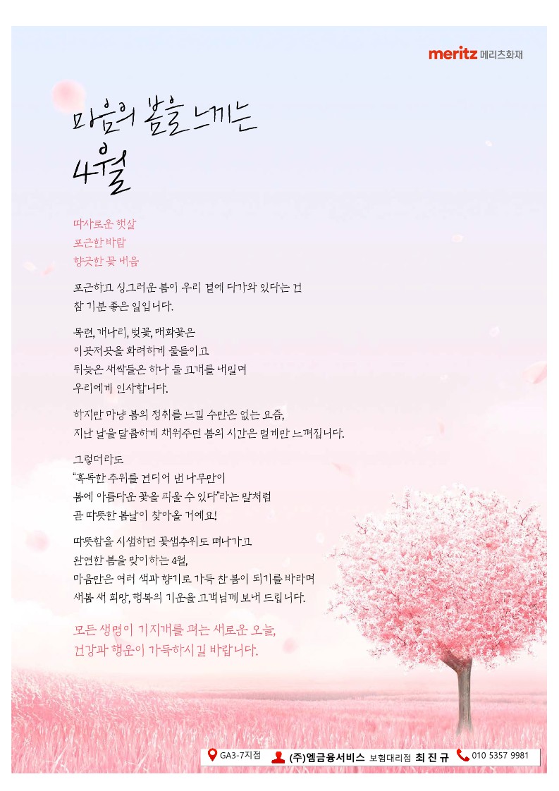 마음의 봄을 느끼는 4월 페이지 정보 작성자 관리자 댓글 0건 조회 354회 작성일 24-04-01 20:25 본문 마음의 봄을 느끼는 4월 목록 목록 이전글스마트폰만 있으면 OK 유튜브로 집콕극복! 24.04.09 다음글안전하고 현명한 금융생활을 위한 사이트 8선 24.03.29