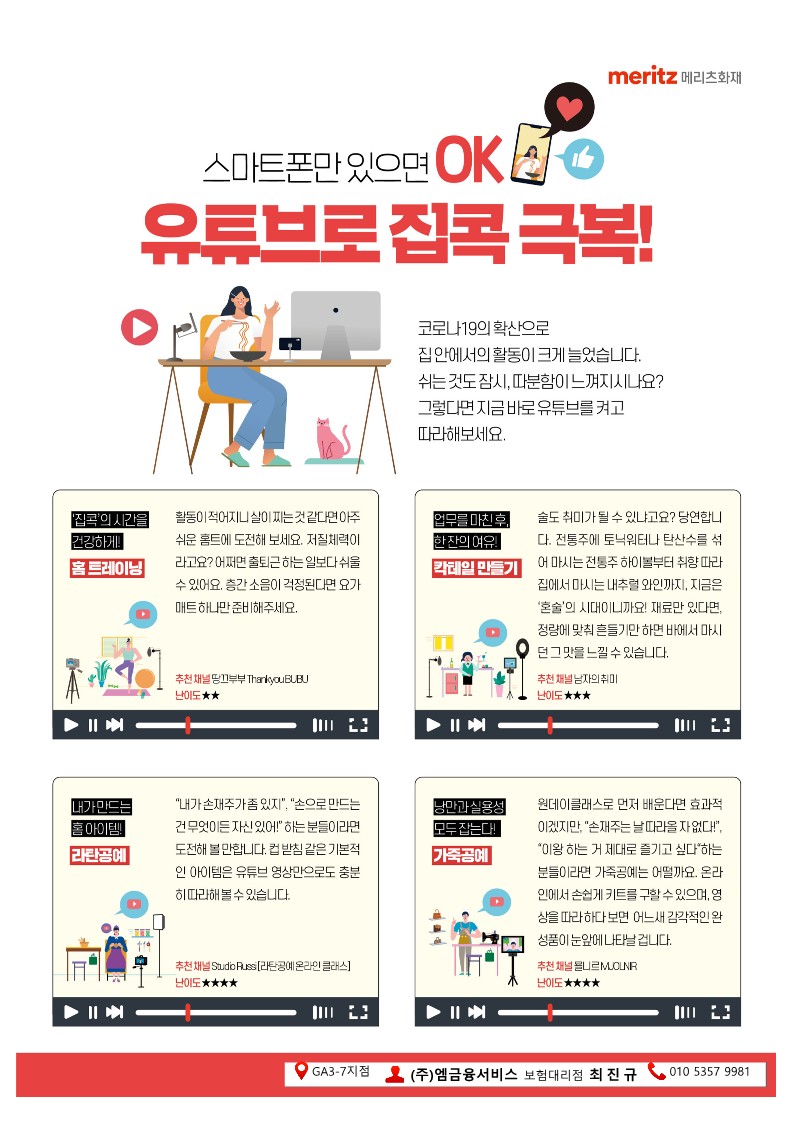 스마트폰만 있으면 OK 유튜브로 집콕극복! 페이지 정보 작성자 관리자 댓글 0건 조회 356회 작성일 24-04-09 10:45 본문 스마트폰만 있으면 OK 유튜브로 집콕극복! 목록 목록 이전글돈 공부 따라잡는 방법 24.04.17 다음글마음의 봄을 느끼는 4월 24.04.01