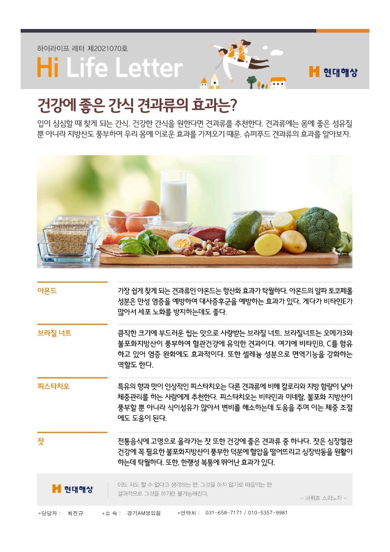 건강에 좋은 간식 견과류의 효과는? 페이지 정보 작성자 관리자 댓글 0건 조회 337회 작성일 21-10-13 17:36 본문 건강에 좋은 간식 견과류의 효과는? 목록 목록 이전글"보장범위만 넓히면 된다"는 말을 조심해야 하는 이유 21.10.26 다음글환절기 대비! 가을철 자동차 관리 TIP 21.10.13