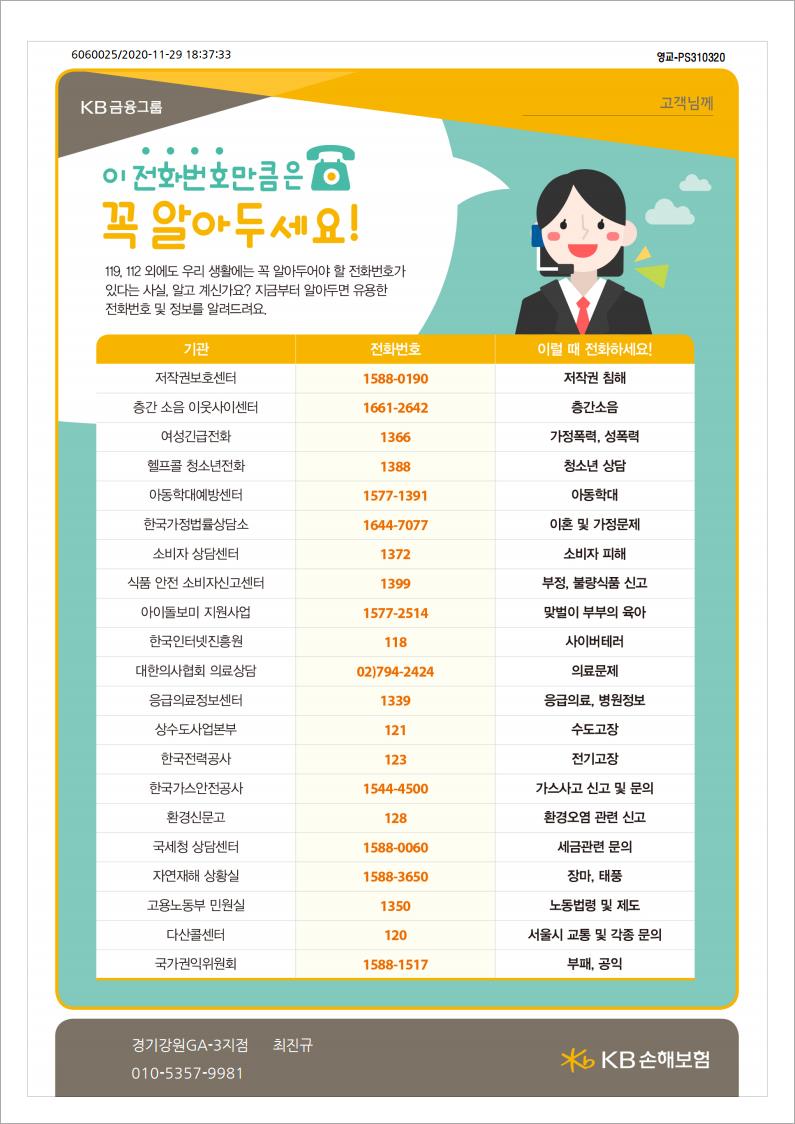 이 전화번호만큼은 꼭 알아두세요! 페이지 정보 작성자 관리자 댓글 0건 조회 379회 작성일 20-11-29 18:42 본문 이 전화번호만큼은 꼭 알아두세요! 목록 목록 이전글신용카드 100% 활용법 20.11.29 다음글겨울철 차량 관리법 20.11.29